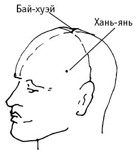 Хань-янь («трясти головой» и «унять (тряску)») расположена на виске, на 3 цуня выше уха по ходу роста волос. Точка используется так же повышении давления при головной боли, головокружении, судорогах, шуме в ушах, снижении остроты зрения из‑за постоянного повышения давления.