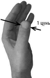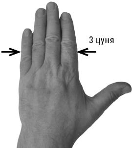 3 цуня – ширина 4 сомкнутых пальцев выпрямленной (правой или левой) ладони (фото 2).