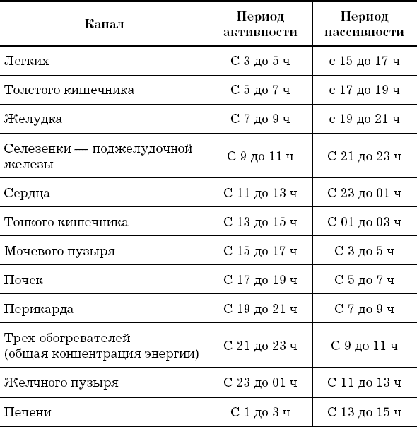 Энергия проходит по каналам последовательно в течение суток, перетекая из одного канала в другой. За 24 часа совершается энергетический кругооборот. Лучше всего воздействовать на определенный канал в период его максимальной активности. Если этот период приходится на время сна, можно использовать для работы время общей концентрации энергии с 21 до 23 часов. Но, главное, не проводить терапию в период пассивности канала.