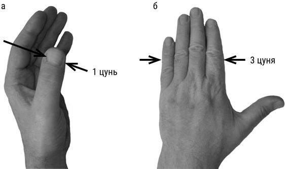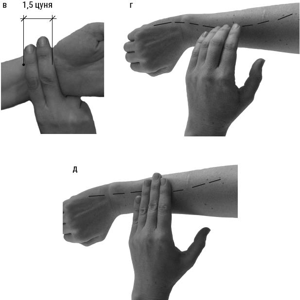 Давайте посмотрим на фото 3, а, б, в, чтобы вспомнить, как быстро отмерить на участке тела 1 цунь, а также 1,5 цуня и 3 цуня.