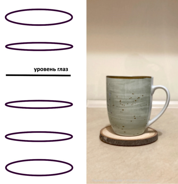 Знание правил построения окружности в перспективе поможет изобразить скетчи композиций, в которых есть предметы цилиндрической формы, например, кружку или вазу. Основаниями цилиндра являются окружности. Окружность в перспективе представляет собой эллипс.