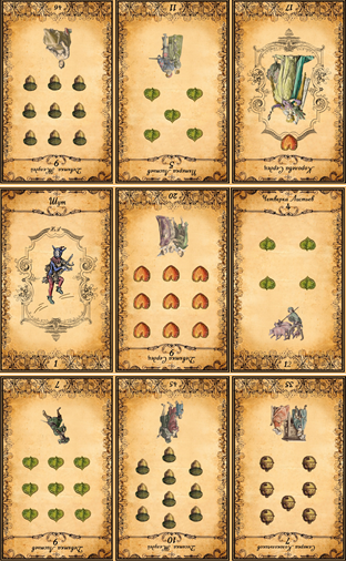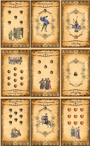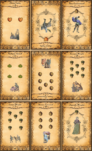 Шестерка Желудей – радость от коротких встреч и общения, прибыли и умение найти прибыльные дела и связи. Богемный образ жизни, высокомерие, презрение к бедным и слабым.