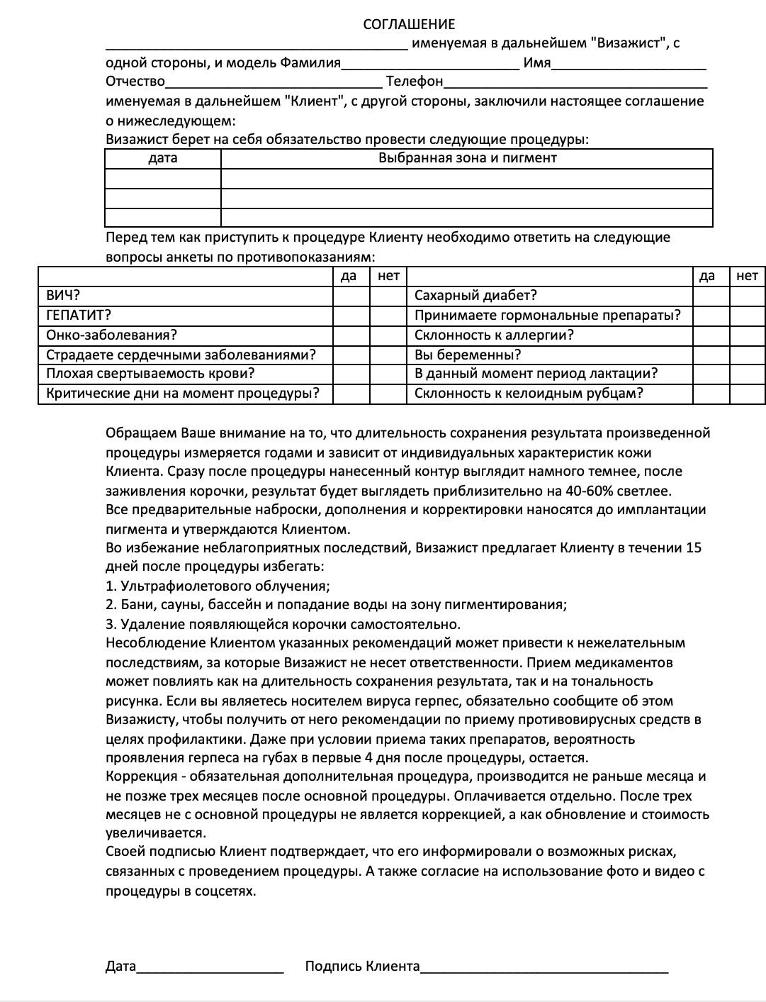 Прежде чем приступать к проведению процедуры, заключите с клиентом соглашение. Так вы обезопасите себя.