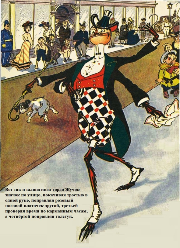 Вот так и вышагивал гордо Жучок-значок по улице, покачивая тростью в одной руке, поправляя розовый носовой платочек другой, третьей проверяя время по карманным часам, а четвёртой поправляя галстук. Конечно, обычным людям странно использовать сразу четыре руки, но Жучок-значок давно к ним привык.