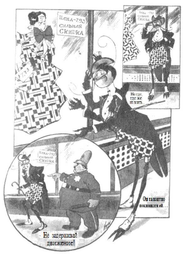 Вскоре он набрёл на роскошный магазин с большими стеклянными витринами, а посередине самой большой витрины стояла персона, настолько ослепительно прекрасная и вообще очаровательная, что от одного взгляда на неё дух захватывало. Приятный цвет воскового лица завораживал, но на самом деле не это привлекло внимание Жучка-значка, а великолепное платье, что было на ней. И не удивительно, ведь это была последняя (прошлогодняя) модель из Парижа, хотя Жучок-значок даже не подозревал об этом, но вкус кутюрье, похоже, был как у нашего героя – платье было невероятно ярким из красной ткани в крупную клетку, ту самую, что среди тогдашних кутюрье прозвали «вагнеровской».