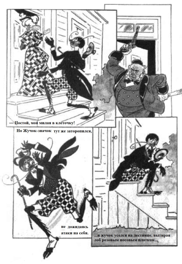 Муж дамы зарычал от ярости и так и подскочил, чтобы наброситься на Жучка-значка с ножом и пистолетом. Но Жучок-значок тут же заторопился, не дожидаясь атаки на себя. И помчался с такой скоростью, что преследователь готов был отступить, тем более что и пистолет не был заряжен, и нож не очень остро заточен, как положено кухонным ножам.