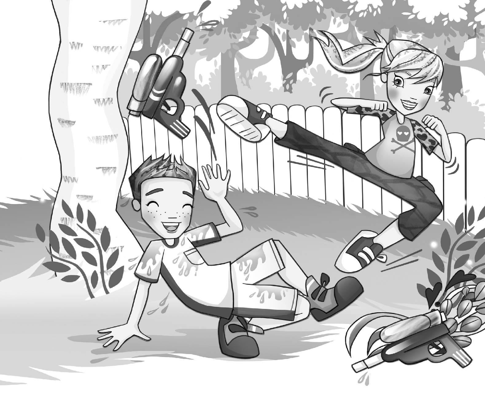 Darting out from behind the tree, she lifted her bright orange mega-soaker and fired a jet of water straight at Sam, her best friend. “Got you, you stinky Swamp Boggle!” she yelled.