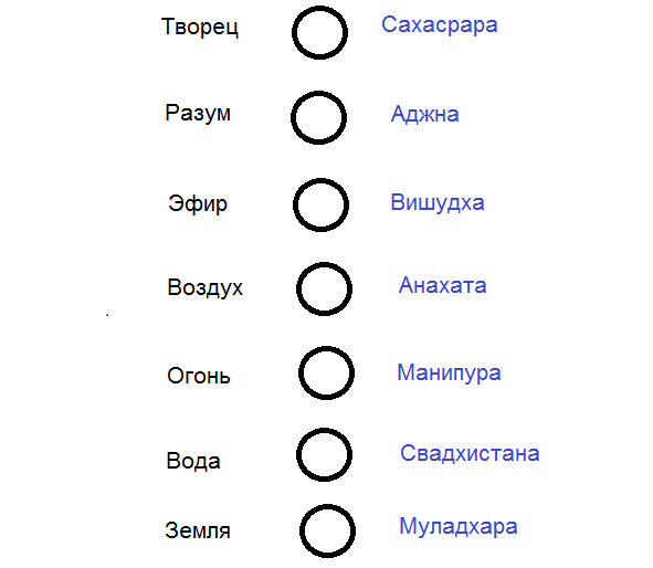 Энергии, проходящие «сверху» создают смесь из самих себя, образуя «уровень». Центр смеси – чакра. Каждая следующая чакра домешивает энергии предыдущей. В итоге, Сахасасрара считается «божественной», а Муладхара «заземленной».