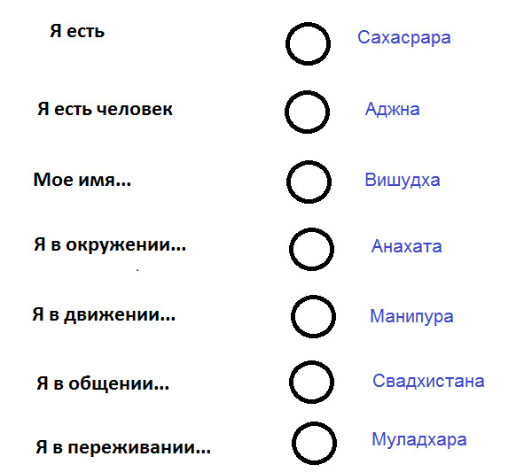 Дзен мастера задают вопрос: «Откуда ты пришел». Ответ человека показывает его уровень восприятия Кто он. Если человек отвечает с точки зрения Муладхары, в его ответе будут события, если с точки зрения Аджны – описание своего понимания Себя.