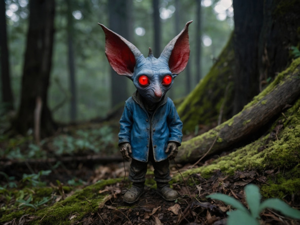 Внезапно тишину прорезал странный звук, похожий на приглушенный стон, переходящий в хриплый смех старика. Один из путников, обернувшись на звук, увидел нечто невообразимое. По земле, стремясь скрыться в тени леса, металось крошечное существо, не более двенадцати сантиметров ростом. Кожа его, голубоватого оттенка, была лишена волос, лишь на лице и шее проступали странные пятна. Из выпуклого лба, словно антенны, торчали удлинённые уши. Красные глаза горели неземным огнём. Нос, похожий на нос грызуна, нервно подергивался. А между тонких пальцев проглядывала тонкая перепонка.