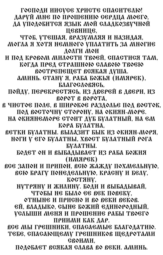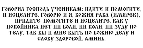 Данный заговор предназначен для использования женой человека, страдающего алкоголизмом. Его необходимо произносить каждый день на протяжении запойного периода. Заговор следует читать на наволочку, которую затем надевают на подушку, на которой спит страдающий алкоголизмом. Утром наволочку следует снимать, стирать и просушивать, а вечером снова надевать на подушку после повторного прочтения заговора. Перед прочтением заговора сложите наволочку 12 раз, поднесите ее прямо ко рту и произнесите текст заклинания.