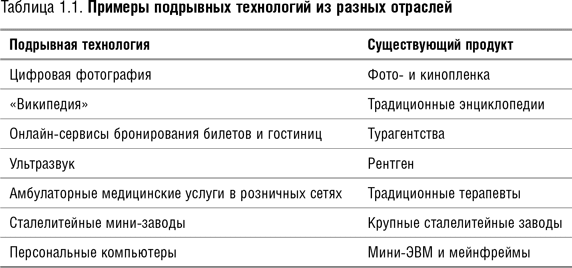 Следствия из теории Кристенсена были абсолютно очевидными, они шокировали и завораживали по двум причинам. Во-первых, его теория была применима практически без каких-либо ограничений. Несмотря на используемый Кристенсеном термин «подрывные технологии», теория применима в любой отрасли – высокотехнологичной или низкотехнологичной. Также она не делает различий между товарами или услугами. Примеры, которые мы рассмотрим далее в этой книге, иллюстрируют действие рыночных сил, которые в итоге нарушили конкурентное равновесие в таких отраслях, как сталелитейная промышленность, книгоиздание, компьютеры, туристические агентства и медицинские услуги. В некоторых случаях в результате появления новых технологий исчезли целые отрасли, однако во многих других случаях подрывной эффект возник скорее как следствие изменений во вполне низкотехнологичных компонентах или появления инновационных бизнес-моделей, а вовсе не из-за новых технологий. Конечно, рост популярности «Википедии» в ущерб Британской энциклопедии не произошел бы без развития интернета, но появление медицинских амбулаторных центров, которые сейчас можно найти почти в любом магазине Walmart, CVS и других розничных сетях, в первую очередь было обусловлено возникновением новой модели предоставления повседневных медицинских услуг: эти центры смогли предложить пациентам более низкие цены, а их посещение оказалось более удобным, чем, например, визит к обычному врачу (табл. 1.1).
