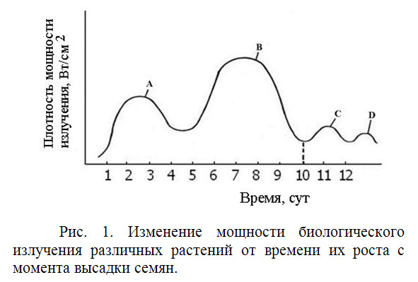 Котов Б.С и Гавинский Ю. В. не только показали воздействие одних растений на другие, но и исследовали характеристики электромагнитного излучения, исходящего от растущих растений. Они провели измерение мощности биологического излучения ростков различных растений в диапазоне волн от 2 мкм до 2 мм в Вт/см2. При этом максимальная мощность излучения растений в период роста составляла от 0.5•10—12 до 1•10—11 Вт/см2. Также авторы построили график зависимости плотности мощности излучения растений от времени их роста, начиная от момента посадки семян (Котов, Гавинский, 1998) (Рис. 1).
