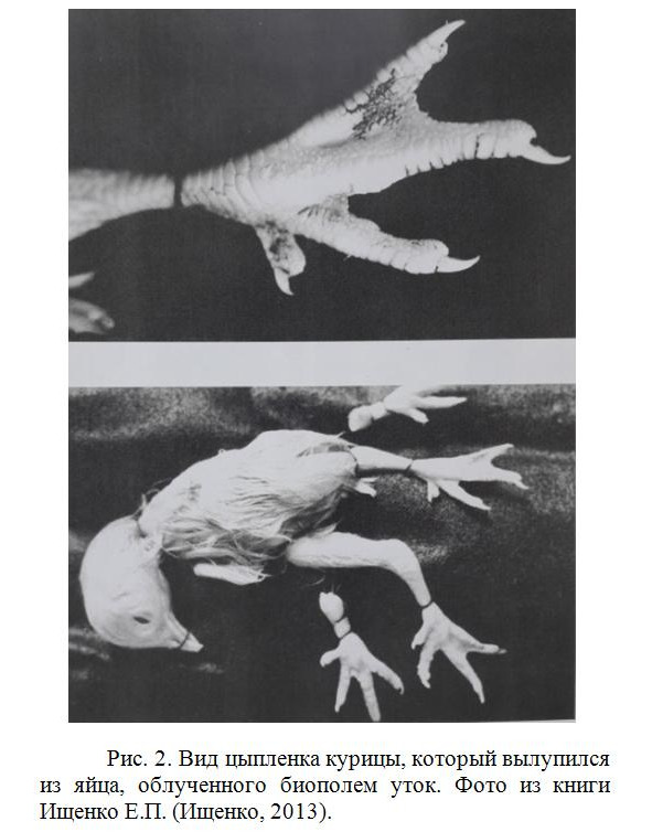 В 1961, 1963 и в 1974 г. Цзян Каньчжен провел 3 эксперимента с одинаковым результатом, в которых облучил куриные яйца биополем уток. В одном из экспериментов Цзян Каньчжен облучал 500 куриных яиц биополем уток в Биотроне в виде сферы диаметром 95 см. Из 480 вылупившихся цыплят было много таких, которые имели признаки уток: с перепонками в лапах (25%), плоскими головами (80%), длинными шеями (70%), с глазами, открывающимися в средней части (90%), широкими клювами, перепонками в ушах, позволяющими нырять (Рис. 2). Такие цыплята по неизвестным причинам жили недолго.