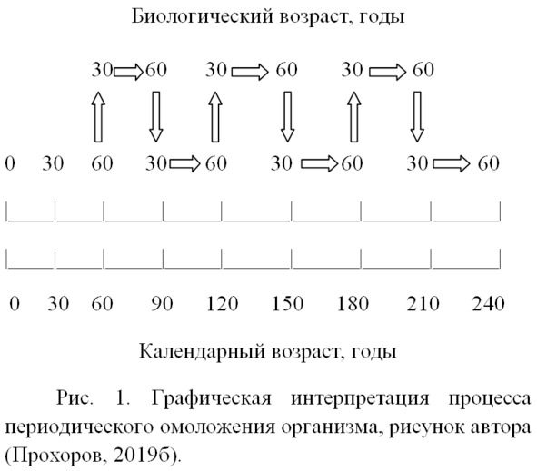 Далее процесс можно повторять аналогично и организм будет колебаться по биологическому возрасту в пределах 30—60 лет, а календарный возраст будет постоянно возрастать и превысит 210, 240 и более лет.