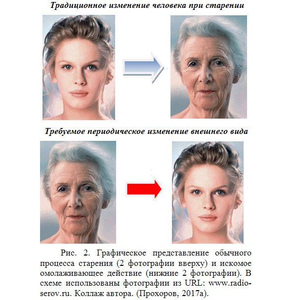 На рис. 2 (верхние 2 фотографии) показано традиционное изменение внешнего вида женщины при старении, а на двух нижних фотографиях показан процесс омоложения, который предполагается периодически осуществлять.