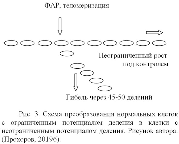 Преобразование нормальных клеток в бесконечно делящиеся предполагалось выполнять с использованием названных автором факторов – активаторов – репрессоров генетического аппарата клеток (ФАР) (Прохоров, 1984, 2019). Этот процесс графически представлен на рис. 3. Овалами на рисунке показаны делящиеся в культуре клетки. В какой-то момент, показанный стрелкой, на них начинают действовать факторы активаторы – репрессоры (ФАР) или применяться способ теломеризации, в результате чего преобразованные клетки получают возможность делиться неограниченное число раз (стрелка направо), а другие клетки, не преобразованные, продолжают деление до своего предела Хейфлика (50—60 удвоений), затем прекращают делиться и гибнут (стрелка вниз).