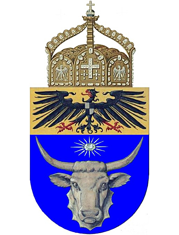 В 1882 г. началась колонизация Намибии Германией и в 1913 г. Колониальное бюро Германии создало для Германской Юго-Западной Африки герб: в голубом поле серебряная голова буйвола, меж рог которой бриллиант, в золотой главе черный германский орел с династическим щитком на груди. Щит увенчан серебряной лентой с названием или кайзеровской короной.