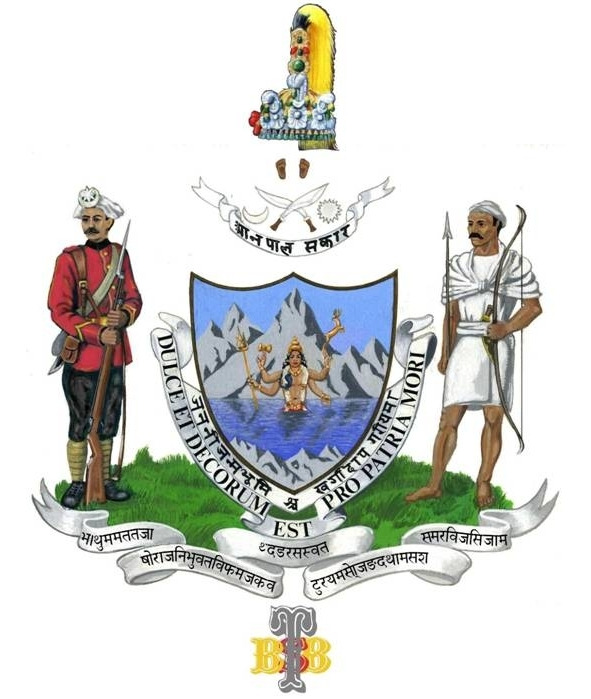 Щитодержатели – два воина-гуркха: в форме гвардейца (справа) и в традиционной исторической форменной одежде. Герб венчают два перекрещенных кукри, над перекрестием которых – два золотых отпечатка ступней бога Вишну, а по сторонам – серебряные солнце и полумесяц, увенчанные короной. На серебряной ленте, полуобрамляющей щит, начертан девиз: «Знание – сила, труд – необходимость». Под подножием герба – монограмма короля Трибхувана Бир Бикрам Шаха «TBBS».