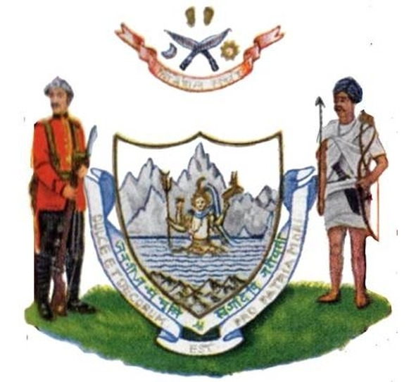 В 1923 г. был учрежден новый герб королевства, который представляет собой треугольный щит с изображением бога Шивы, выходящего из вод озера, расположенного у подножия Гималаев.