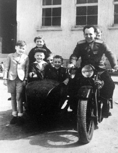Первый год у меня почти не было русских приятелей – моего возраста были только жившие по соседству мальчик – сын старшины и девочка – дочка генерала. Поэтому в нашей компании преобладали немецкие дети. Я очень быстро научился говорить по-немецки, говорил свободно и нередко помогал родителям в качестве переводчика (правда, папа мог обходиться и без моей помощи – он говорил с немцами на идиш, и они его понимали). Играли мы с немецкими детьми вполне мирно, я не помню ни одного случая межнациональной розни. Папа частенько выкатывал свой мощный мотоцикл с коляской, сажал нас, человек пять, вповалку и вез кататься за город. Потом немцев из нашего района выселили, образовался советский военный городок, ко многим военным приехали семьи, появилась у меня русская компания, и я постепенно стал немецкий язык забывать. Сейчас я, к сожалению, совершенно его не помню, и лишь иногда, откуда-то из подсознания, вдруг выскакивают немецкие слова и целые выражения.