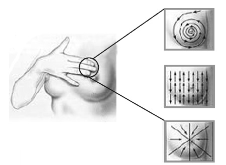 ♦ после внешнего осмотра приступают к пальпации (ощупыванию) груди. Начинают этот этап в положении стоя. Внутренней поверхностью сомкнутых пальцев с умеренным придавливанием к грудной стенке осматривают верхние отделы молочных желез (по очереди), перебирая пальцами сверху вниз;