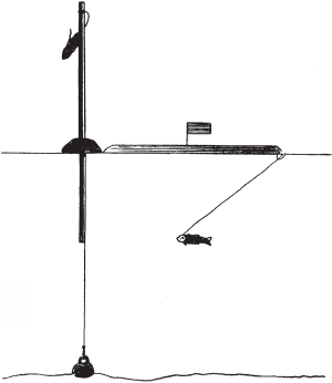 На длинное удилище набивается пробка в 2/3 его длины, в том расчете, чтобы более длинная верхняя часть несколько перевешивала короткую нижнюю. К тонкому верхнему концу прикрепляется басковый поводок с жерличным крючком, к толстому нижнему – бечева, на которой свободно ездит кольцо груза (железная гиря), служащее для удержания всего снаряда в известном положении. Таким образом, при помощи этих простых приспособлений и лодки можно установить снаряд на любом месте на поверхности, на любой глубине и под любым наклоном к горизонту. Так как поводок короче длинной части удилища, наклоненной к горизонту, то живец не может запутаться. Все движения его будут только поворачивать весьма подвижный снаряд вокруг оси. Такое приспособление дает возможность воткнуть удилище в воду в тех местах, где бьет шереспер, изменить наклон его, то опуская живца глубже, то выводя его на поверхность, смотря по надобности; в случае сильного ветра или донного жора (клева) – спрятать весь снаряд в воду на любую глубину; в случае затишья и если рыба бросится хватать поверху – снова вывести его на поверхность, задерживать и попускать захватившую добычу, подтягивая или поддавая бечеву, которая привязывается к берегу, к короткому, но очень упругому удилищу. Необходимо лишь, чтобы бечева шла непрерывно от баска и до руки охотника; при этом он не рискует потерять добычи, если бы даже деревянная часть снаряда сломалась во время скачков и ударов попавшейся рыбы. Необходима также прочная бечева, хорошо просмоленная или проваренная и вытянутая, чтобы она не баранилась (не крутилась) в воде и свободно бы проходила в кольцо груза, которое, конечно, следует делать с закругленными краями.