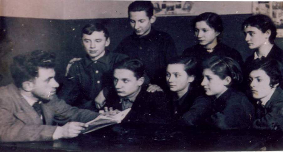 Классный руководитель Лазарь Михайлович Эзрин беседует с учениками 9-а класса 1941 г. Первый слева во втором ряду Владимир Шаев