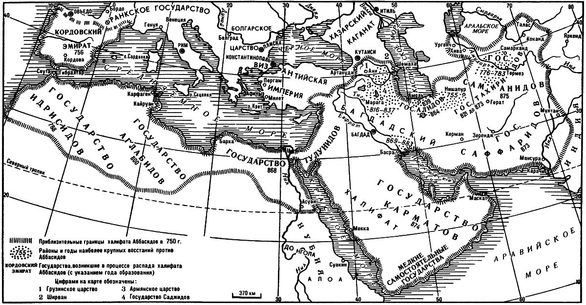 К Аббасидам примкнули все группы населения халифата, обиженные Омейядами: иранские крестьяне, бедуины-кельбиты и беглые рабы; мусульмане – сунниты, шииты, хариджиты; немусульмане – маздакиты, манихеи, несториане и огнепоклонники. Силы Мервана таяли, и в январе 750 г. все было кончено. Аббасиды, пришедшие на смену Омейядам, должны были управляться со всем этим разнообразием, а это было очень трудно. Первый халиф, Абу-л-Аббас (749–754), ознаменовал свое вступление на престол резней членов рода Омейя, хотя те выразили готовность ему подчиниться. Второй, Мансур (754–775), предательски убил Абу-Муслима, благодаря которому династия взошла на престол. Его сын Махди (775–785) открыл дорогу дворцовым интригам, в результате чего его наследник Хади (785–786) был убит и власть досталась другому его сыну – Харуну ар-Рашиду (786–809), незаслуженно прославленному в своде новелл «Тысяча и одна ночь». На самом деле это был жестокий деспот, казнивший своих лучших помощников – визирей из рода Бармекидов.