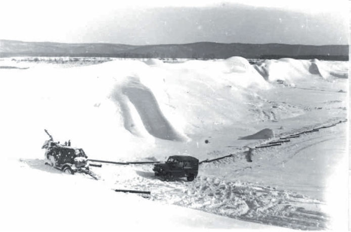 Рис. 19. Намораживание большой ледяной плотины из техногенного льда на р. Амга в Якутии, объёмом 440 тыс. м 3 (фото автора).