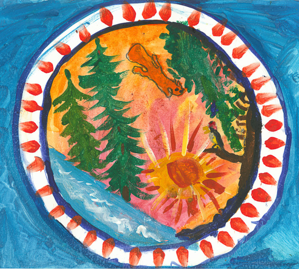 Настало утро. Солнце всходило за деревьями, белочки прыгали с ветку на ветку, а Дятел решил позавтракать и начал стучать. И все проснулись.
