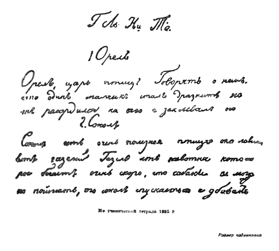 Г Ль: Ни: То.1 ОрелъОрелъ, царь птицъ. Говорятъ о немъ, что одинъ малчикъ сталъ дразнить, но онъ рассердился на него и заклевалъ его.