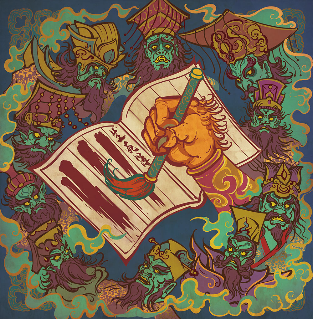 Десять царей преисподней заведуют загробным миром и распоряжаются жизнью и смертью всего сущего. Вот они слева направо: царь Циньгуан, царь Чуцзян, царь Сунди, царь Угуан, царь Яньло, царь Пиндэн, царь Тайшань, царь Души, царь Бяньчэн и царь Чжуаньлунь.