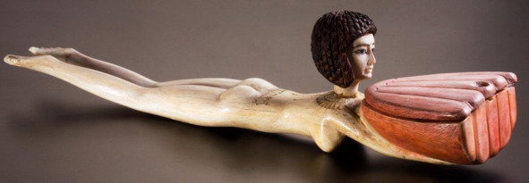 Сосуд выполнен в форме цветка розового лотоса и снабжен крышечкой, которая отодвигается в сторону. Ручка из слоновой кости представляет собой фигурку плывущей обнаженной девушки. На ее голове темно-коричневый парик из эбенового дерева, разделенный на прямоугольные рубчики, имитирующие локоны. Шея обрамлена выгравированным ожерельем из лепестков лотоса, талия украшена орнаментальным пояском. На деликатно моделированном лице девушки выделяются обведенные черным штрихом большие миндалевидные глаза и плавно изогнутые брови.