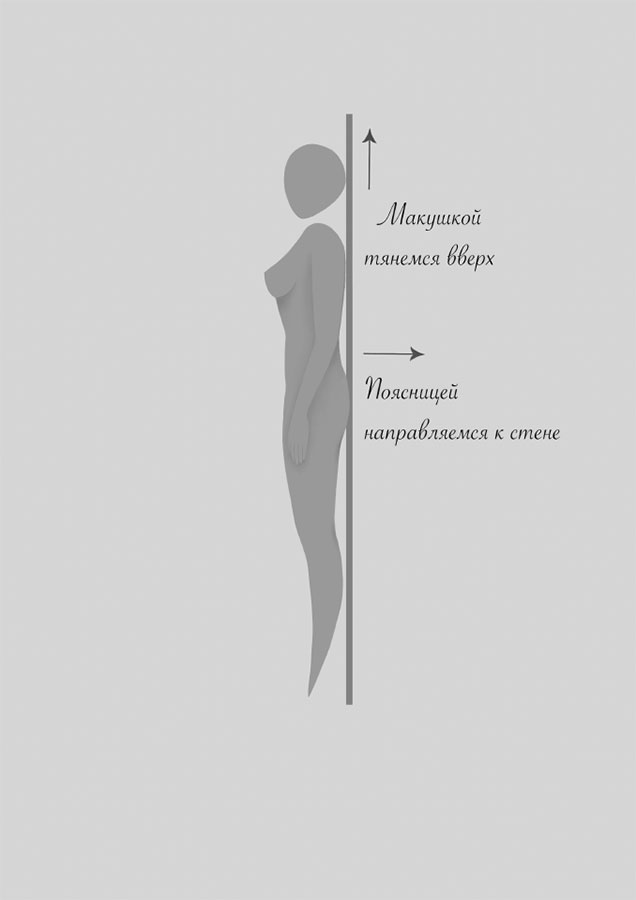 • потянуться макушкой вверх, при этом напрягая все мышцы тела: бедер, ягодиц и низа живота, – а также стараясь прижать поясницу к стене, даже если это и кажется невозможным;