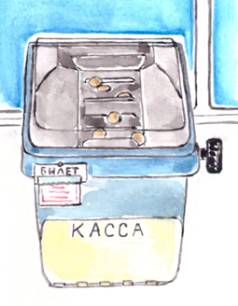 Раньше не было кондукторов. В автобусе прямо под окном, напротив входной двери было прикреплено устройство для покупки билета. Бросаешь пять копеек, крутишь колёсико, выползает билет – и ты