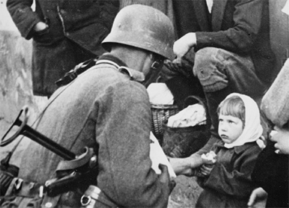 Значительная часть этнических поляков считает себя ответвлением некоей древней германской расы, или же потомками ираноязычных сарматов, но никак не славянами. По какой-то неведомой причине объединение сил увеличившийся с 1938 г., 90-миллионной Германии, и 35-миллионной Польши, для их похода на Восток, не состоится. В ином случае СССР и его англо-саксонские союзники вряд могли бы рассчитывать на выигрыш в войне. Постановочная фотография – немецкий солдат, вероятно угощает чем-то, настороженную польскую девочку