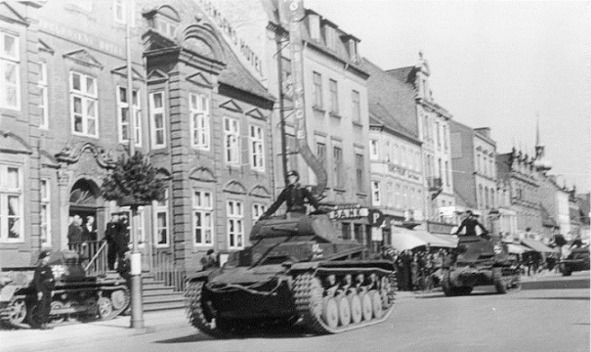 …Данию и Норвегию угрожают захватить сразу два центра силы: Англия и Германия. Дания склоняется к протекторату Германии, руководители страны (этнические немцы, как правило) отдают приказ не сопротивляться вторжению; которое состоялось в марте 1940 года, и стоило жизни тринадцати датским и двум германским солдатам. Рейх приобретает хорошего поставщика сельскохозяйственной продукции, полтора десятка военных кораблей, а также шеститысячный добровольческий корпус, воевавший на Восточном фронте вплоть до своего расформирования в 1943 году. Фотография – немецкие танки Т-2 на улицах Копенгагена (Дания)