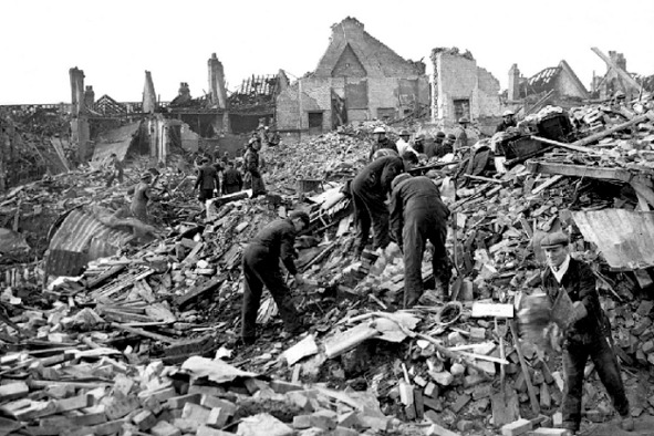 10 мая 1940 года Бельгия и Голландия получают от немецкого командования ультиматум с упреками в нарушении нейтралитета – беспрепятственном пропуске английских самолетов над своей территорией, а также возведении обращенных в сторону Германии долговременных укреплений. Нота призывает Голландию не препятствовать входящим в страну, не как враги, немецким войскам; которые, впрочем, к этому моменту уже находятся на земле Нидерландов. Правительство страны плотин и сыра запрашивает помощи у англичан и французов, их экспедиционные корпуса начинают выдвигаться для установления связи с голландцами. Немецкие парашютисты захватывают стратегически важный мост у Роттердама, что позволяет немецким танкам блокировать все крупные голландские пехотные части. Под угрозой бомбардировки Роттердама выдвигается требование о полной капитуляции государства. Ультиматум принимается, однако, в результате ли ошибки, или преднамеренного действия 60 бомбардировщиков «Хейнкель 111» сбрасывают на город 97 тонн бомб. Голландия сдается спустя пять дней после начала войны. Потери голландской стороны: 2330 солдат и офицеров, 70 самолетов, (68 «Тайфунов» теряют ВВС Англии), а также 2000 гражданских лиц, немецкой – около 3000 военных, 275 самолетов. На фотографии – руины предместий голландского Роттердама после германских бомбардировок