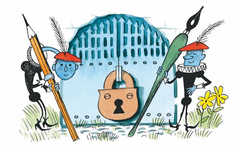 Согнутый держал огромный карандаш, а прямой – такую же ручку. Они стояли неподвижно, словно неживые. Я подошёл поближе и потрогал согнутого пальцем. Он не пошевелился. Кузя обнюхал их обоих и заявил, что, по его мнению, они всё-таки живые, хотя человеком от них не пахнет. Мы с Кузей назвали их Крючок и Палка. Наш мяч рвался в ворота. Я подошёл к ним и хотел попробовать толкнуть замок. А вдруг он не заперт? Крючок и Палка скрестили ручку и карандаш и преградили мне дорогу.