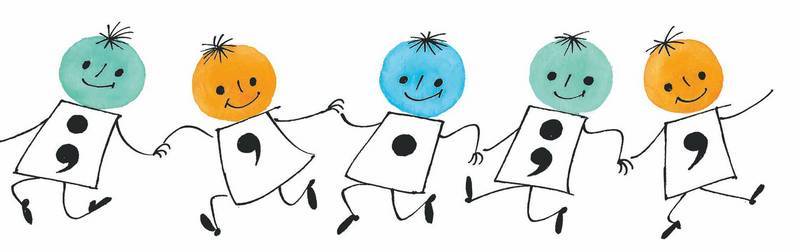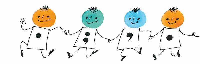 Глагол снова взмахнул линейкой, и точек сменили человечки, на платьицах которых были вышиты две запятые. Они взялись за ручки и спели: