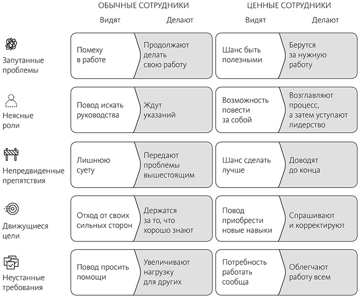 Ценные сотрудники в нашем исследовании видели в повседневных сложностях возможности. Для них нечеткие инструкции и меняющиеся приоритеты – это шанс увеличить отдачу. Запутанные проблемы, которые нервируют и огорчают других, наполняют их энергией; отсутствие ясности не парализует, а подталкивает действовать; предложение что-то изменить интригует, а не пугает. Наверное, самое фундаментальное отличие заключается в том, что они не считают проблемы помехами, отвлекающими от работы; скорее проблемы – это и есть работа, причем не только для них, но и для всех остальных.
