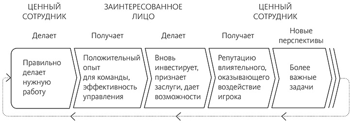Взамен ценные сотрудники получают репутацию звезд и зарабатывают доверие, которое им пригодится, чтобы справляться со все более важными задачами, которые им начинают поручать. Перед ними открывается возможность внести еще более значительный вклад и продолжить цикл: они делают больше, их действия становятся еще весомее, в них видят лидеров, воплощающих ценности организации, и они быстро превращаются в образцы. Когда они приобретают влияние на господствующие в компании порядки и культуру, коллеги начинают их уважать и стремятся подражать им.