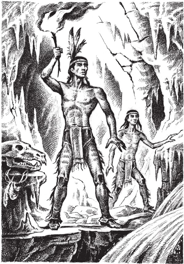 Вождь Маттотаупа – Четыре Медведя, – встав на колени, отцепил от пояса лассо, перекинул один конец веревки через ствол дерева с мощными обнаженными корнями и, крепко держась за оба конца веревки, стал осторожно спускаться вниз, прижимаясь к скале, чтобы не стать мишенью для того, кто, возможно, прятался за круглым выступом. На вожде были узкие кожаные штаны с широким поясом и мокасины. Собранные в косички волосы падали на плечи. На шее у него висел на сыромятном ремне нож в кожаном чехле. Другого оружия, даже томагавка, у него с собой не было. Вождь перелез через круглый выступ – половины длины лассо оказалось для этого достаточно – и исчез из поля зрения мальчика. Две минуты его было не видно и не слышно. Наконец из-за выступа показалась его рука. Он жестом велел сыну следовать за ним. Харка быстро спустился вниз, где перед черной зловещей дырой – входом в пещеру – стоял отец. Осторожно нащупывая ногой покатый пол пещеры, вождь сделал несколько шагов вперед. Харка повторял все его действия. Когда отец сел, он тоже опустился на камень. Стены пещеры были влажными, воздух удушливым. Откуда-то издалека, из глубины горы, доносился мягкий, почти напевный звук. Мальчик прислушался и невольно придвинулся к отцу. Опасность от человека им в эту минуту не грозила, так как, скрытые темнотой, они уже не представляли собой удобную мишень для врага. Но терять бдительность было нельзя. Харка полностью полагался на опыт отца, бывалого воина.