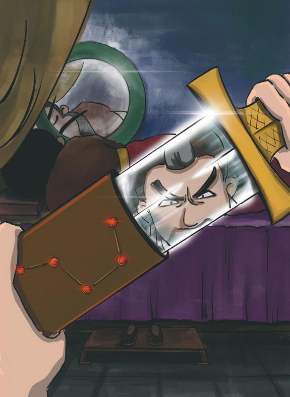 Дун Чжо взял кинжал и, полюбовавшись на сверкание драгоценных камней, занес его высоко вверх, сделал удар и… одним махом рассек пополам бронзовое зеркало, что висело на стене над изголовьем. Цао Цао осенило: когда он вынимал кинжал, блеск лезвия отразился в зеркале и разбудил Дун Чжо.