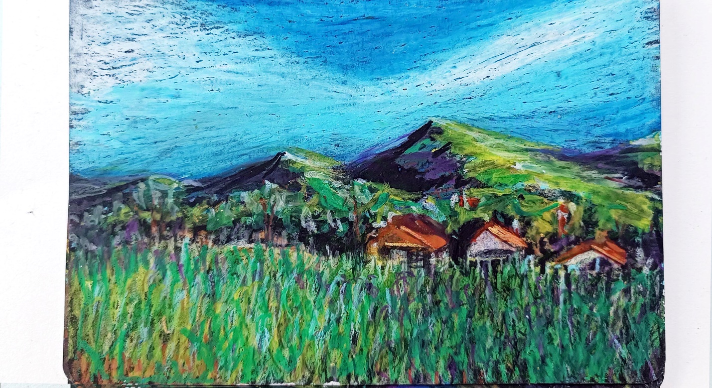 За нашим домом зелёное поле, на зелёном поле растут острые пучки лемонграсса, между чем-то и всей остальной зеленью ходят курочки. За полем видно пару домов, а за ними, за деревьями, плавная гора. За этой горой – залив между странами. А левее от дома за четвёртой горой, середина острова; всего на нашем острове девяносто девять маленьких гор.
