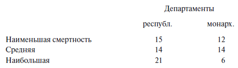 Наибольшая смертность преобладает, стало быть, в департаментах республиканских. Это явление легко объясняется тем, что монархисты менее скучиваются в больших городах и промышленных центрах, дающих наибольшую смертность, что нисколько не колеблет установленного нами принципа касательно преобладания гениальности и революционных стремлений в местах наиболее здоровых, так как высокий рост есть более точный показатель благоприятных для здоровья условий жизни, чем смертность.