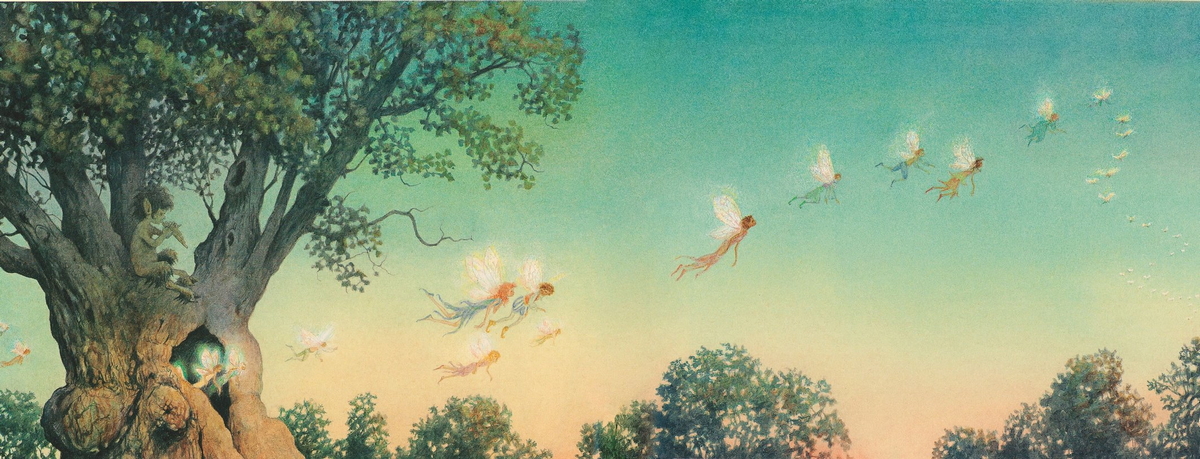 Звуки трубы эхом разнеслись по лесу – и тут же из своих жилищ роем стали вылетать феи. Крылья, поднявшие их в воздух, были начищены до блеска и сияли так ярко, что не уступали звёздам. Казалось, в долине проложила себе путь широкая, искрящаяся в лунном свете река.