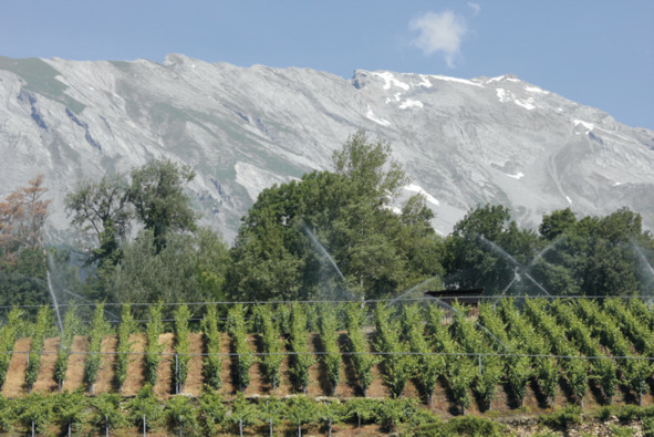 В кантоне Вале мне меньше всего понравился тур на «ирригационный центр» виноградников, сложный механизм с непростой технологией, функции которого мне были объяснены в мельчайших подробностях. Я признаюсь, не был особенно внимателен… и постепенно оставил малую группу гостей с целью понаблюдать за виноградниками и близлежащими окрестностями – незабываемое зрелище. Заметив капельное орошение в некоторых местах, я вдохновился идеей написать отчерк об использовании воды на виноградниках по сравнению с другими видами сельского хозяйства.