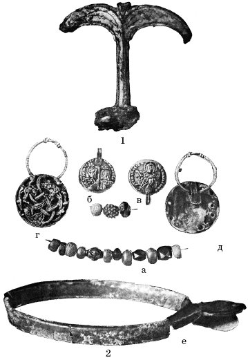 Наносник от шлема и погребальный инвентарь. 1 – наносник от шлема, найденного в усадьбе Десятинной церкви, 2 – инвентарь из погребения IX–X вв. знатной женщины. Раскопки 1908 г. в усадьбе Десятинной церкви. Киев.: а) сердоликовые, пастовые и серебряные с зернью бусы, б, в) – имитация византийского солида императоров Василия I и Константина (869–879 гг.), г, д) серебряная фибула, превращенная в медальон, е) серебряный ободок деревянного ковша.